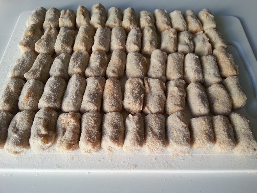 8 . - Cortamos con las tijeras los churros, del tamaño deseado, y ya tenemos casi listas las croquetas.