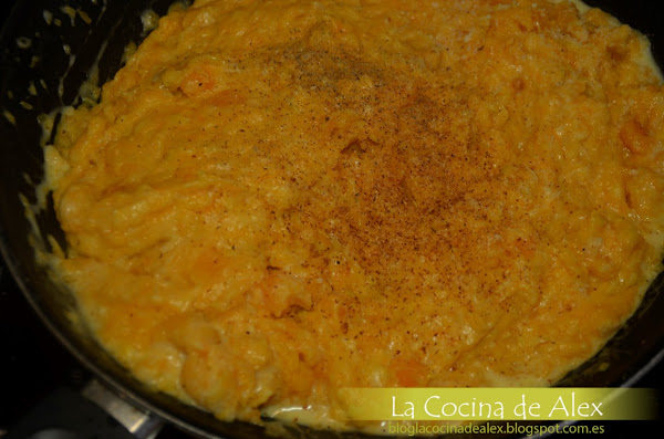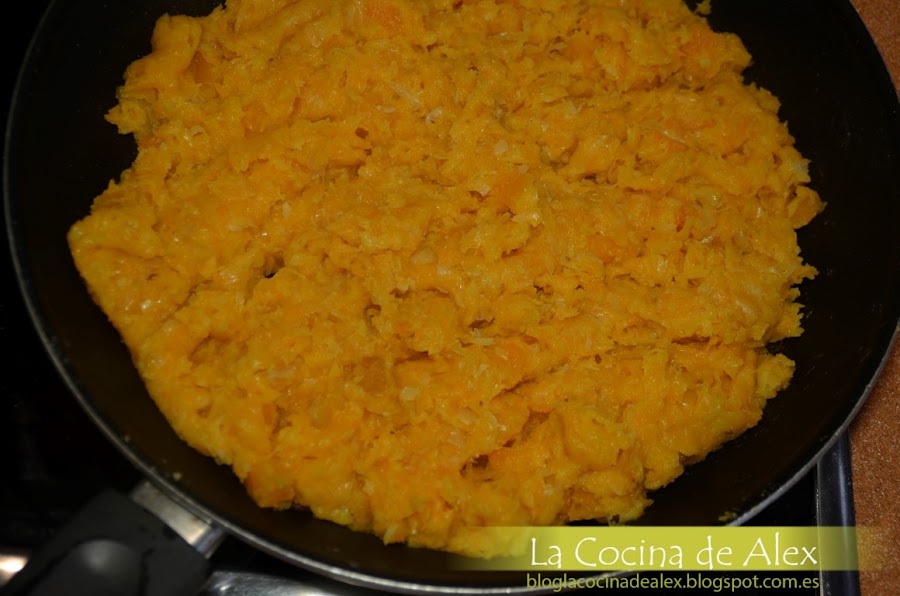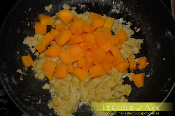 A continuación añadimos la calabaza cocida escurrida, reservando el liquido que hay podido quedar en el bol. Cocinamos todo junto a la vez que vamos machacando con una pala o con un tenedor, no os preocupéis si queda algún trozo un poco mas grande, esta buenisimos cuando nos lo comamos.