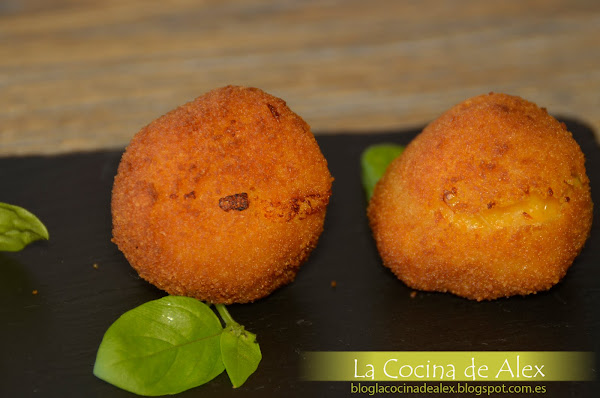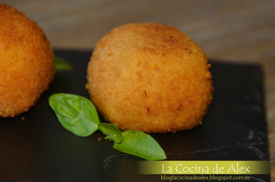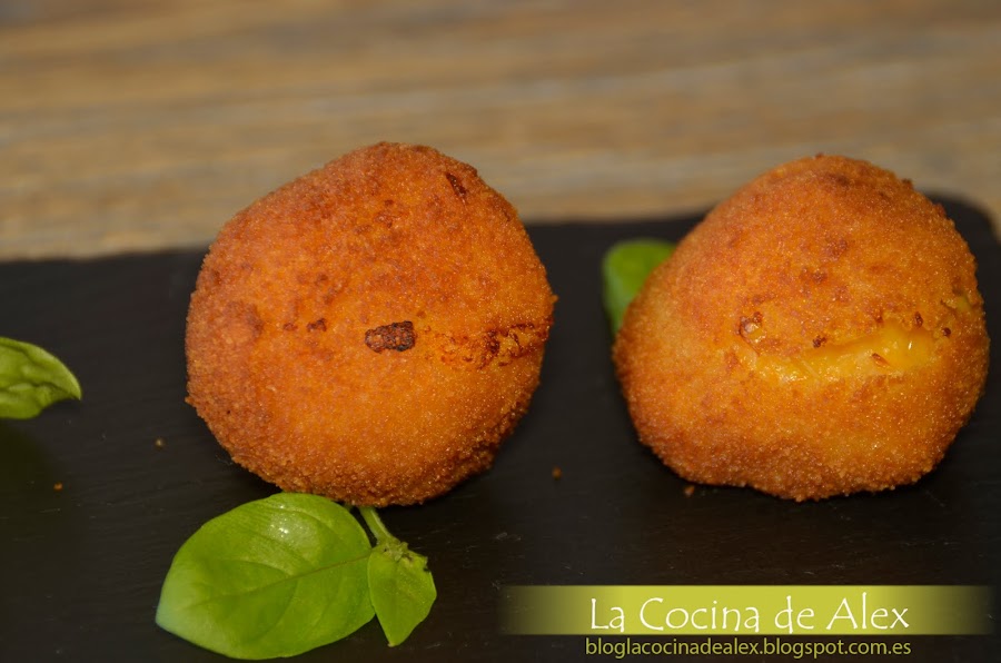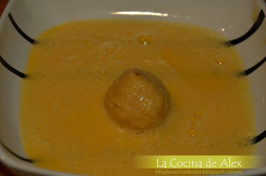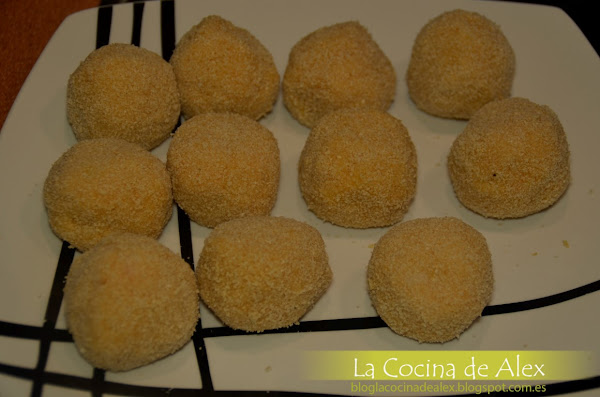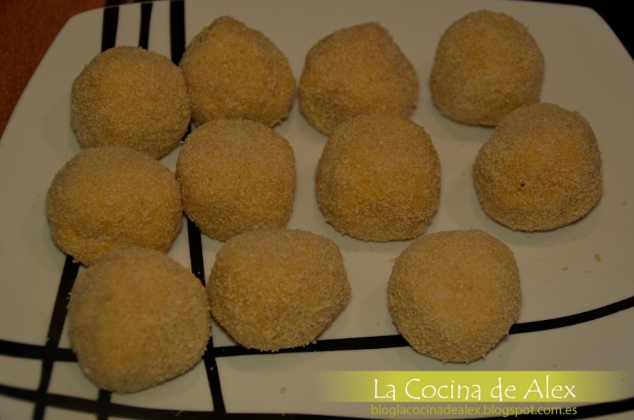 Formamos la croqueta con la forma que mas os guste, en nuestro caso hemos hecho bolas. Las pasamos por pan rallado, huevo batido y otra vez por pan rallado para formar una capa exterior mucho mas crujiente.