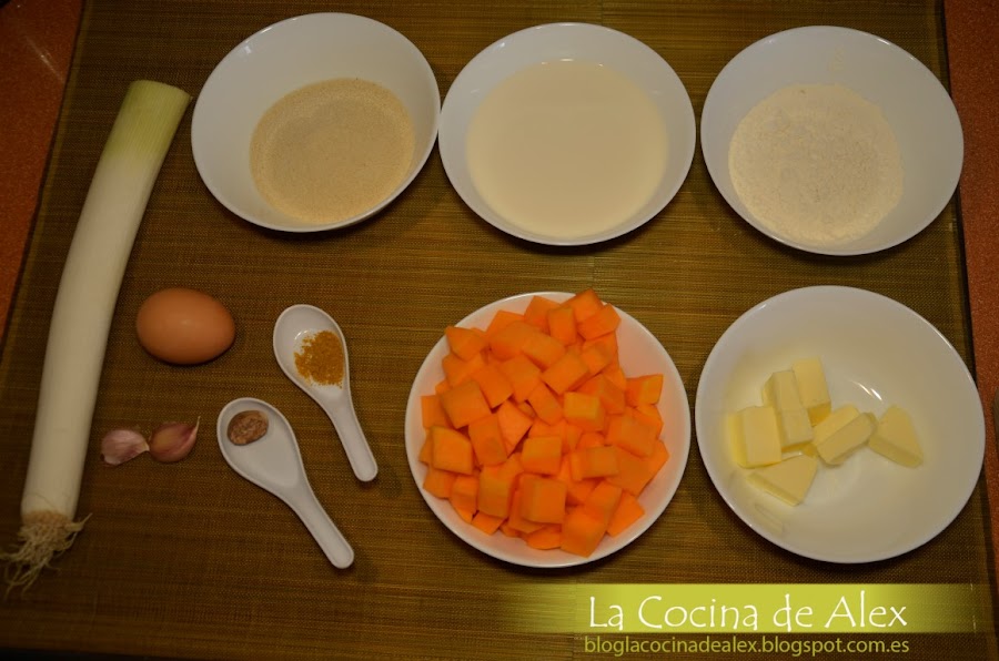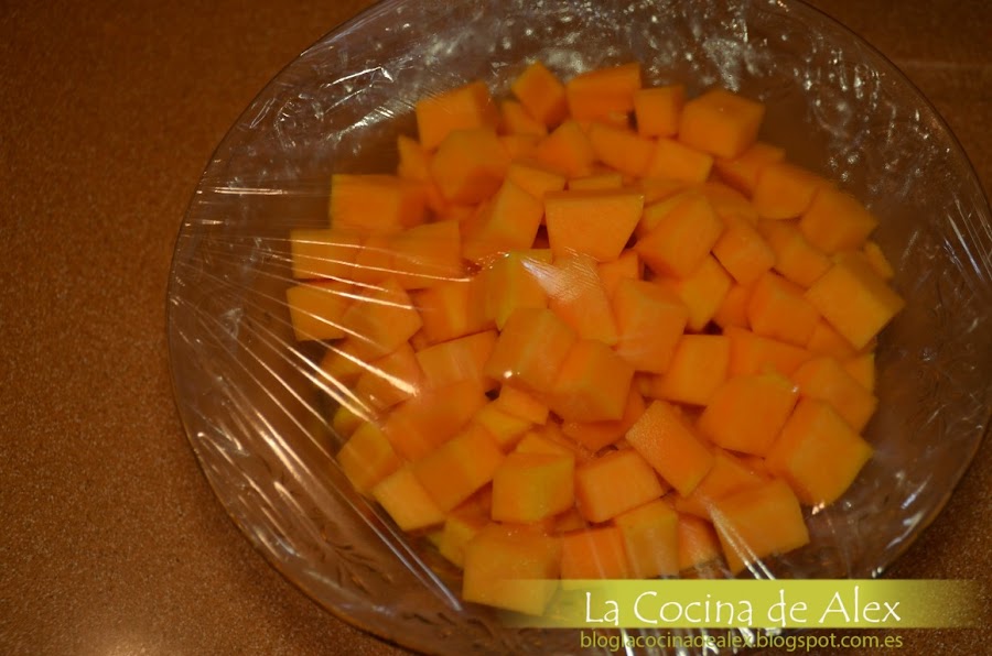 Mientras cocinamos el puerro, troceamos la calabaz, la ponemos en un bol tapado con un film y la cocinamos en el microondas a máxima temperatura durante unos 10 minutos.