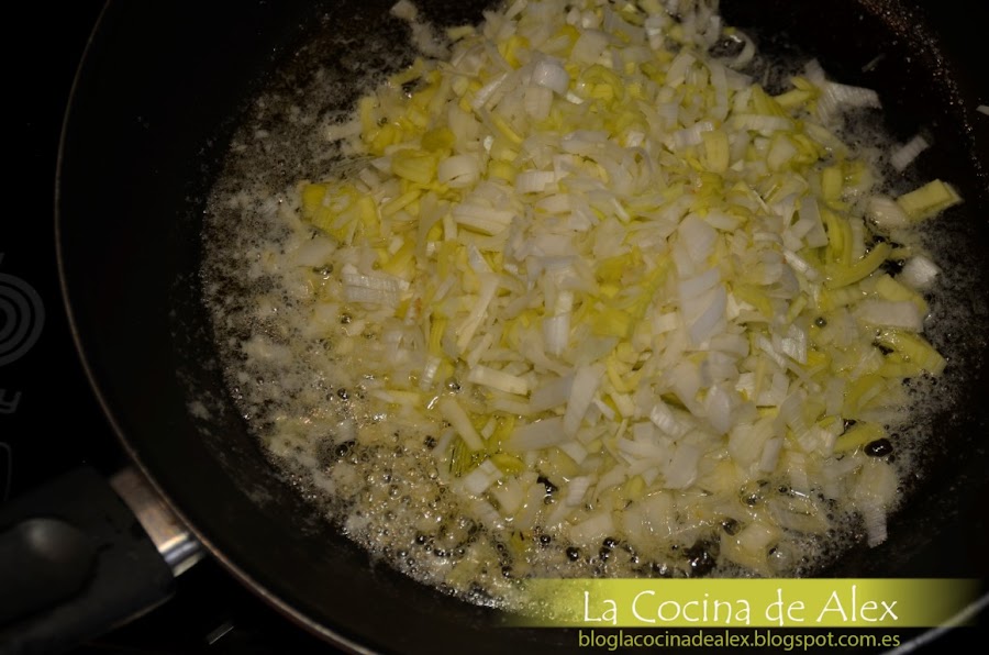 Picamos el puerro también lo mas pequeño posible, lo añadimos a la sarten y seguimos sofriendo a temperatura media para intentar que no coja color tostado.