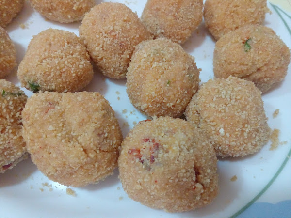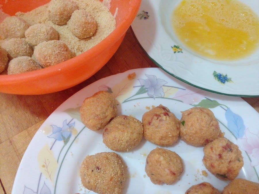 Hacer bolitas pequeñas (como para un bocado), pasarlas por el huevo batido y posteriormente por el pan rallado.