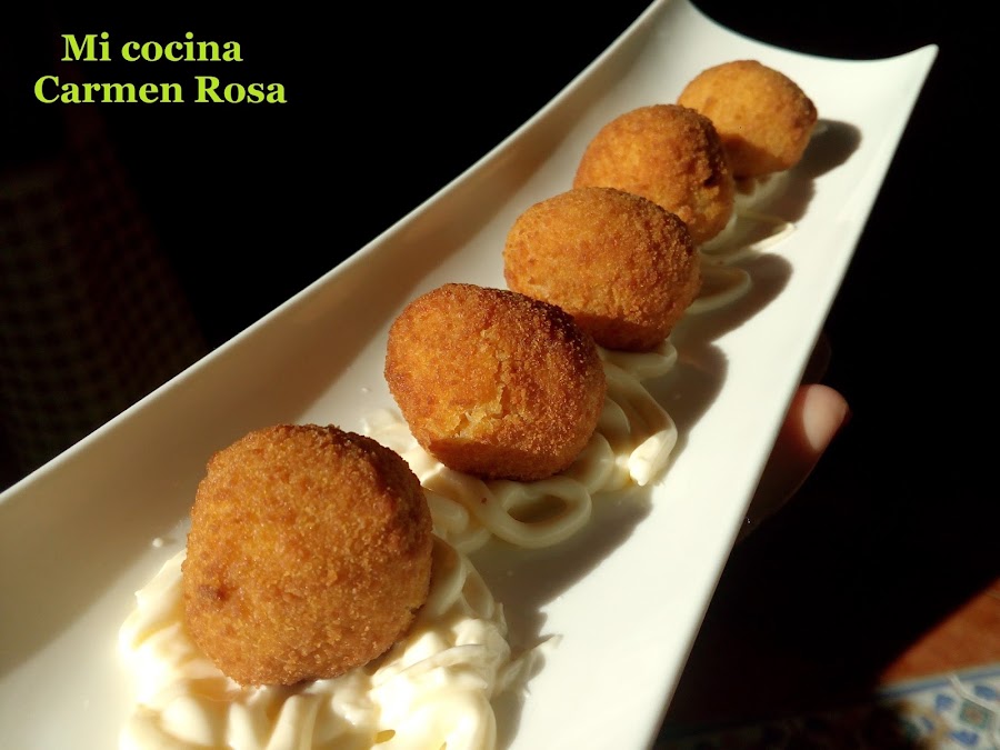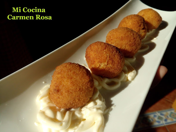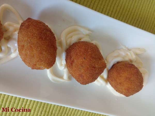 Cuando las vayan a servir, freirlas en abundante aceite muy caliente (suelo usar freidora). Servir sobre mayonesa espolvoreando con pimentón.