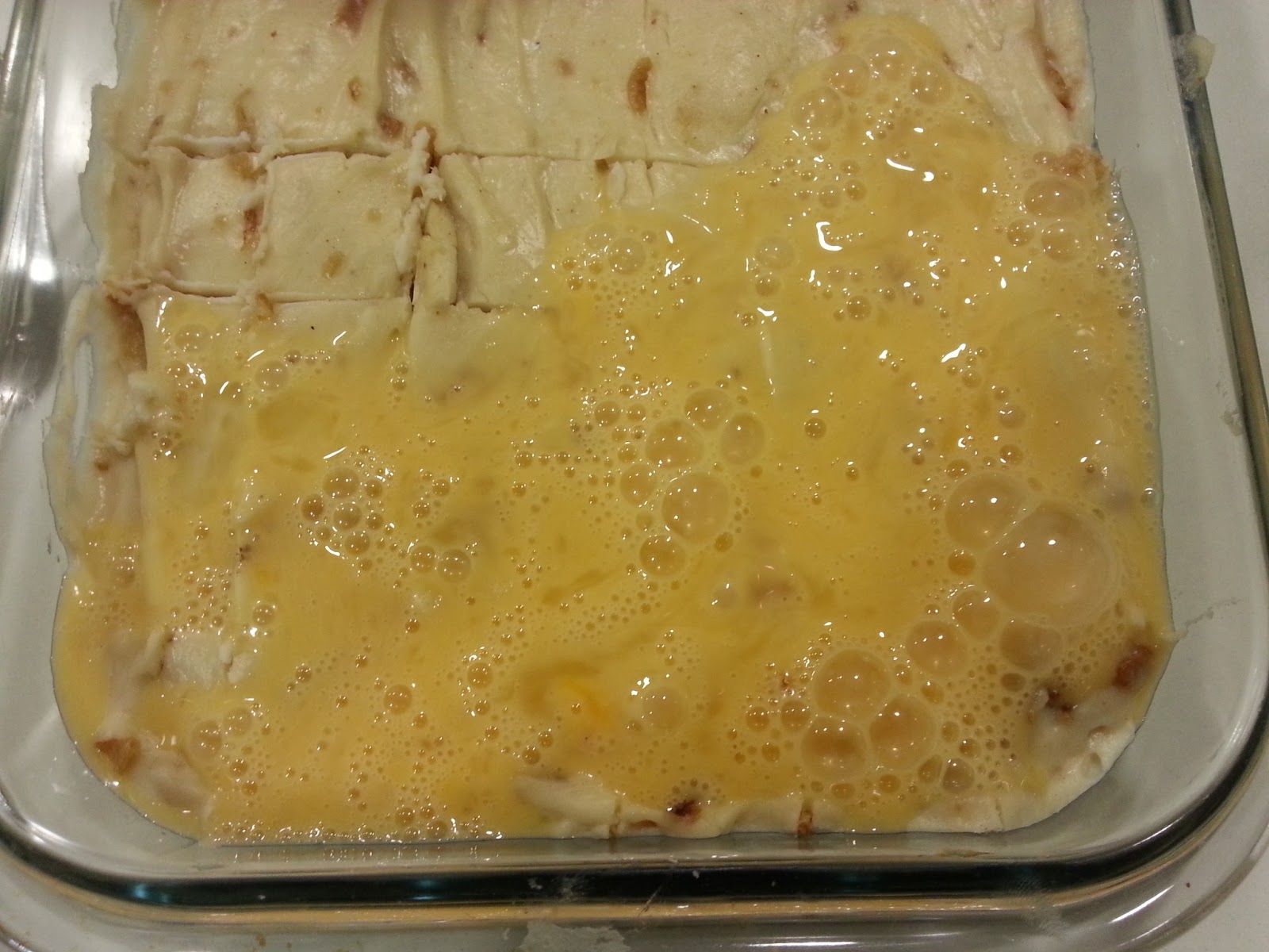 8. - Yo, como soy muy flojísima, bato el huevo y lo echo por encima de la masa y ya las saco directamente al pan rallado, así ahorro en tiestos y huevos. Y ya están listas.