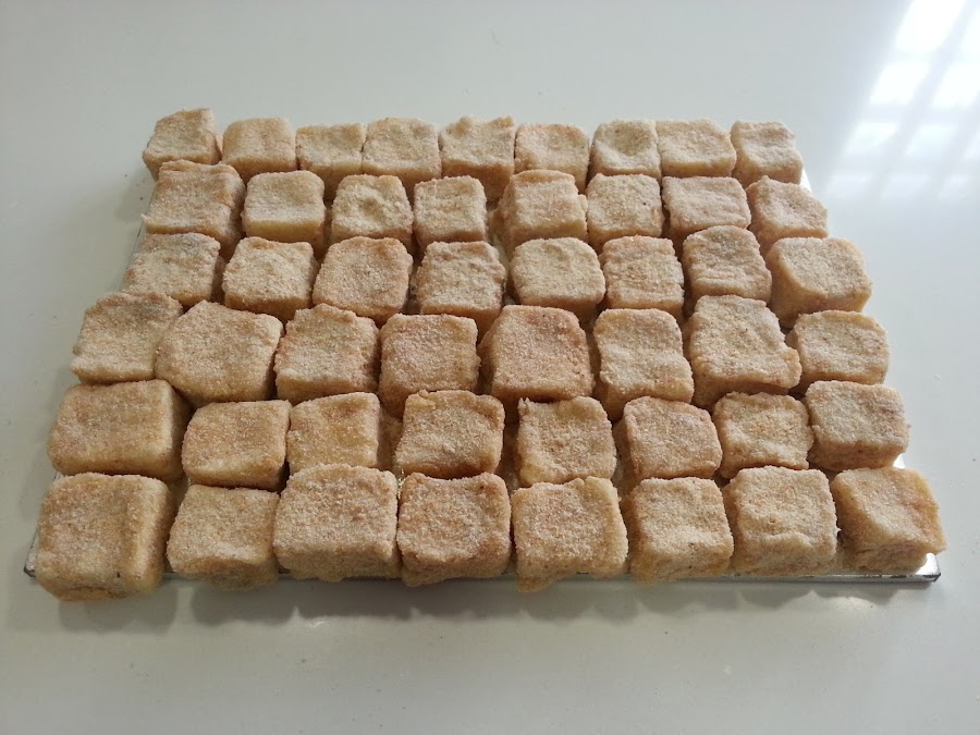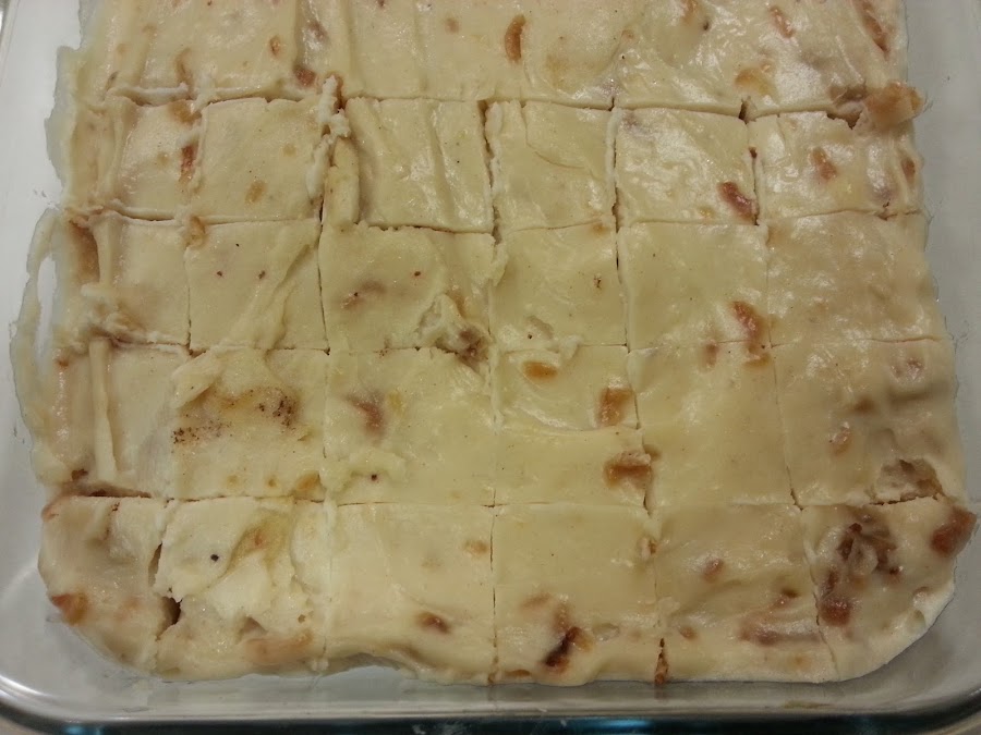 7- Para formar las croquetas , pasamos un cuchillo de punta y hacemos cuadritos del tamaño deseado.