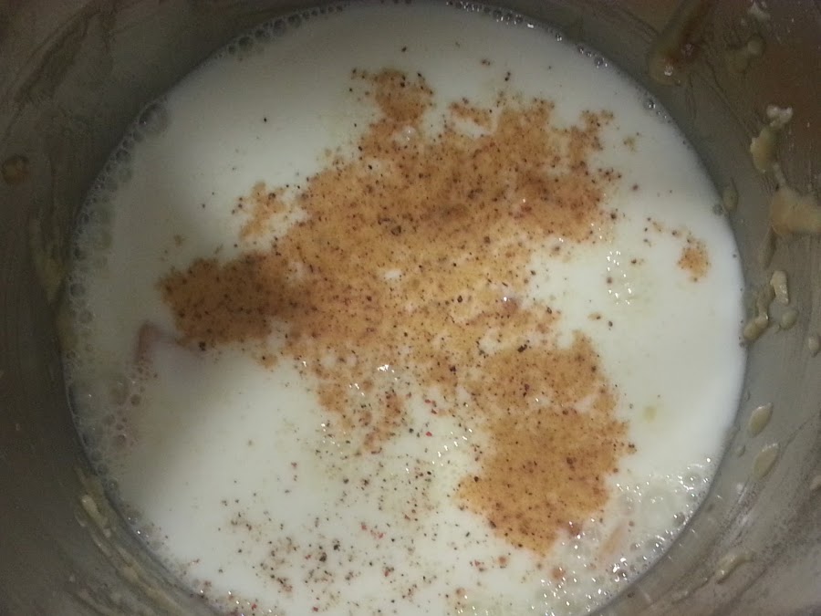 3. - Agregamos la leche, sal, nuez moscada y pimienta y remover durante unos 10 minutos, hasta que esté una bechamel espesita.