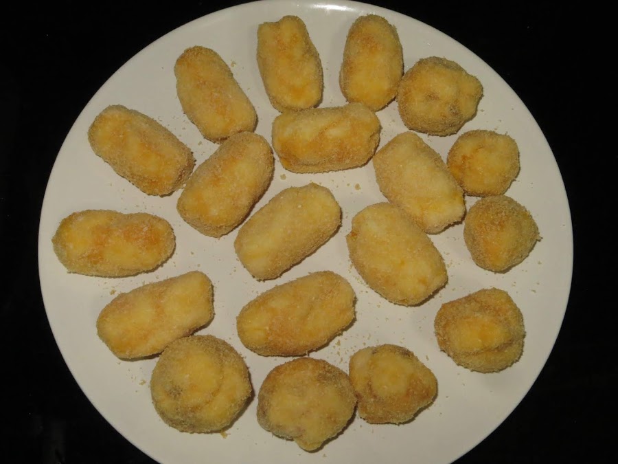 Pasado el tiempo, ponéis un plato con huevo batido y otro con pan rallado, dais forma a vuestras croquetas, las pasáis por pan rallado, luego por huevo y finalmente por pan rallado. Ponéis aceite en una sartén y cuando esté caliente las vais friendo por tandas, las escurrís en papel absorbente y ya están listas para servir.