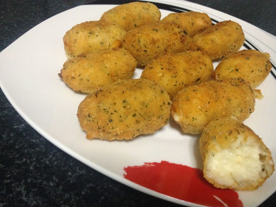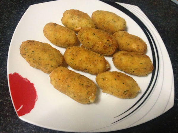 4º - Con la masa ya dura , damos la forma que queramos a las croquetas . Prepararemos un plato con pan rallado mezclado con perejil picado y otro con los huevos ya batidos , lo que nos servirá para hacer el rebozado de las croquetas .