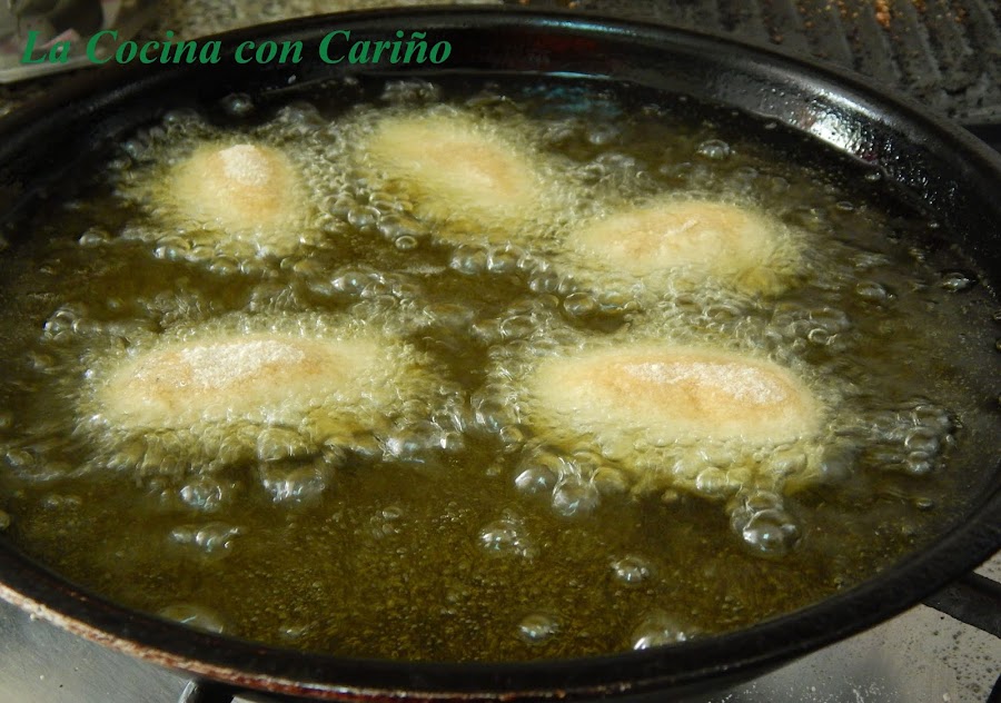 Meteremos en el congelador, despegadas unas de otras y las tendremos un par de horas y las sacaremos 15 minutos antes de freírlas. Lo hacemos para que el interior no se ponga blando con el calor demasiado pronto y se nos exploten. Freiremos en aceite caliente pero a fuego medio, escurriremos en papel y dejaremos reposar unos 5 ó 6 minutos antes de comer