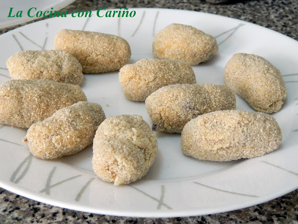 Ponemos en un bol amplio 3 ó 4 huevos batidos con un par de cucharadas de agua, esto evitará que se nos formen hebras. Tomamos con una cuchara la masa y la vamos recogiendo alternativamente con otra cuchara, hasta forma una bola, croqueta o la forma que deseemos. Pasamos por pan rallado, luego por huevo y finalmente por pan rallado y las dejamos dentro del pan un minutillo. Con esto conseguimos que se nos adhiera más y mejor el pan rallado. Vamos colocando en una bandeja.