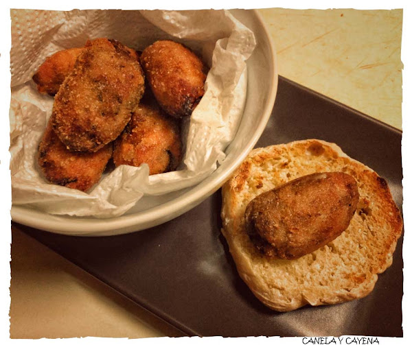 Paso 3: Pasado ese tiempo, ya podemos dar forma a nuestras croquetas. Para ello preparamos en un plato harina, y en otro pan rallado. Le damos forma con las manos o con dos cucharas, como nos sea más sencillo. Hacemos una bolita o de forma cilíndrica del tamaño que prefiramos y las pasamos primero por huevo y después por pan rallado. Por último las freímos en aceite de girasol abundante bien caliente los primero 2 minutos, girándolas para que no se nos quemen, y después durante unos 5 minutos más (dependerá del tamaño) a fuego medio.