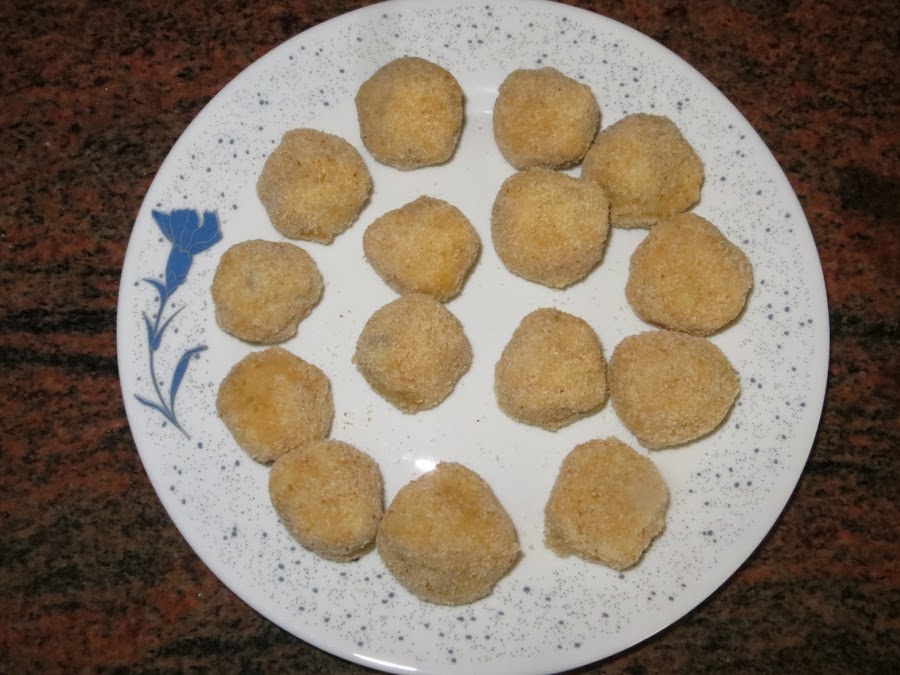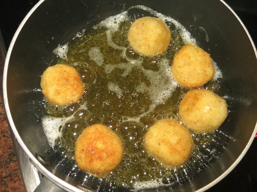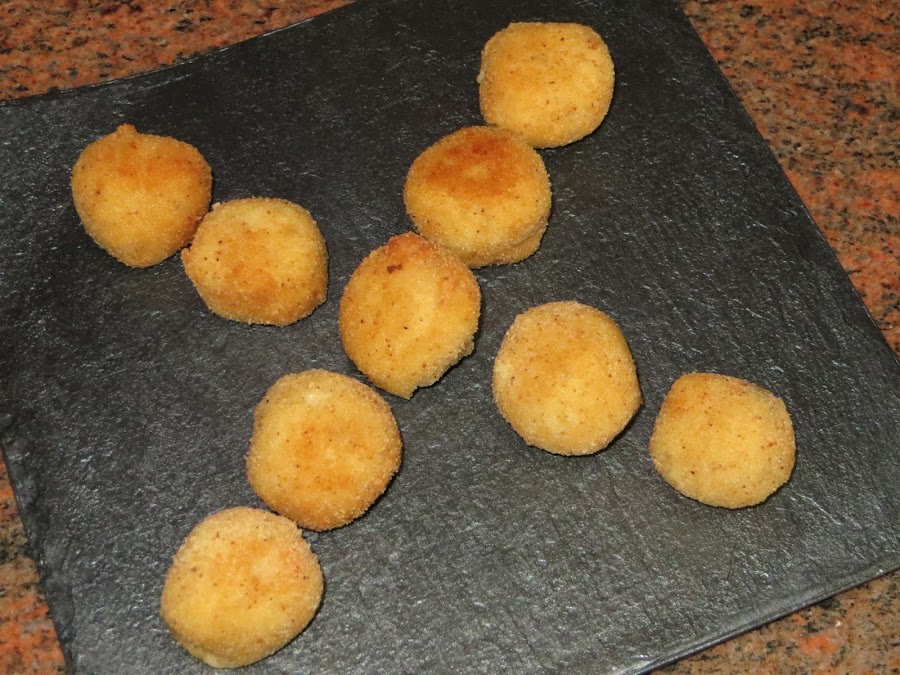 Sacamos la bechamel, hacemos las croquetas de la forma que más os guste, en este caso redondas y las pasamos por pan rallado, huevo y otra vez por pan rallado y las ponemos a freír en abundante aceite. Cuando estén doradas las sacamos a un papel absorbente y ya están listas para comer.