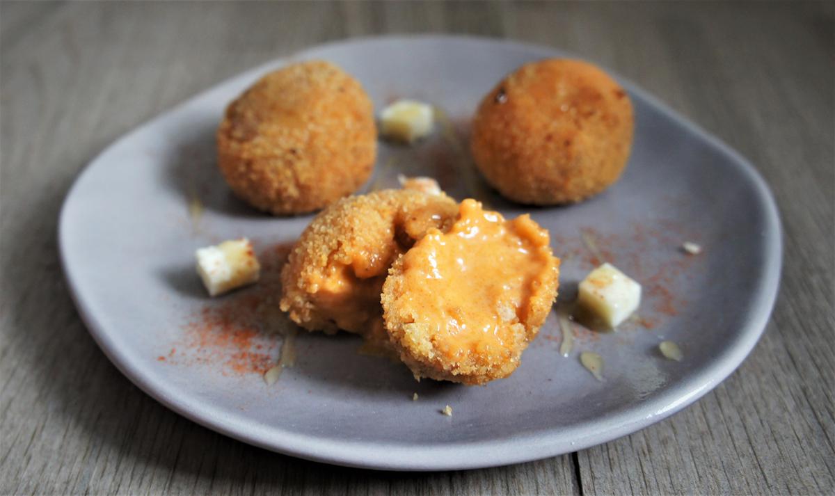 Al día siguiente, cogemos un poco de masa y le damos forma con las manos engrasadas con un poco de aceite (esto hará que no se nos pegue tanto a las manos) o con un par de cucharas. Pasamos cada croqueta por huevo y pan rallado.