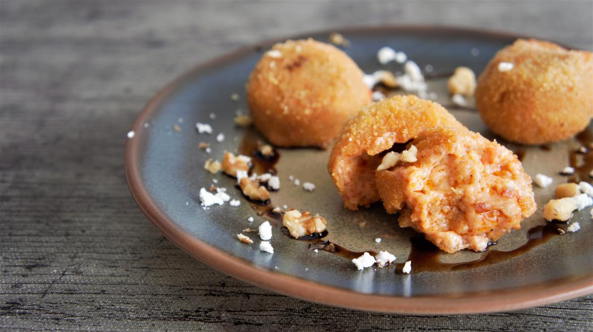 Al día siguiente, cogemos un poco de masa y le damos forma con las manos engrasadas con un poco de aceite (esto hará que no se nos pegue tanto a las manos) o con un par de cucharas. Pasamos cada croqueta por huevo y pan rallado.
