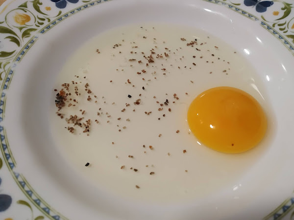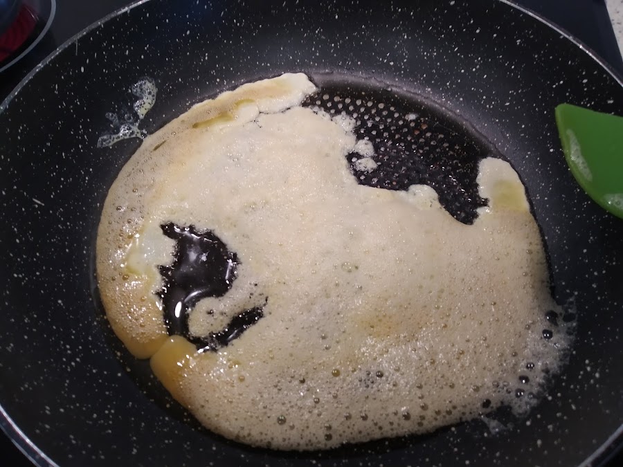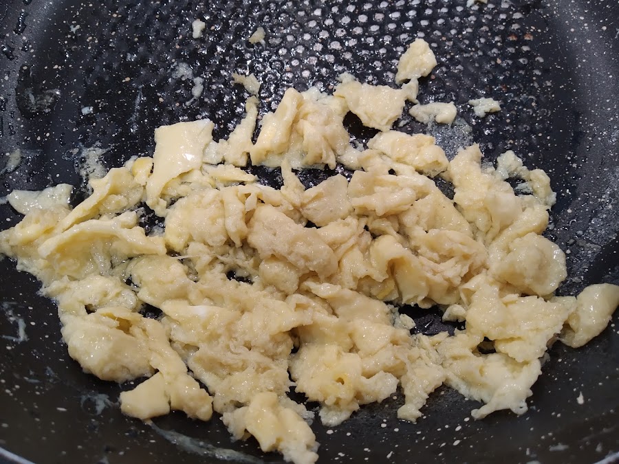 Batir uno de los huevos y en la misma sartén, aprovechando los jugos de las gambas echar el huevo, salar con sal del Himalaya, remover continuamente hasta obtener un revuelto no demasiado hecho. Apartar del fuego y reservar.
