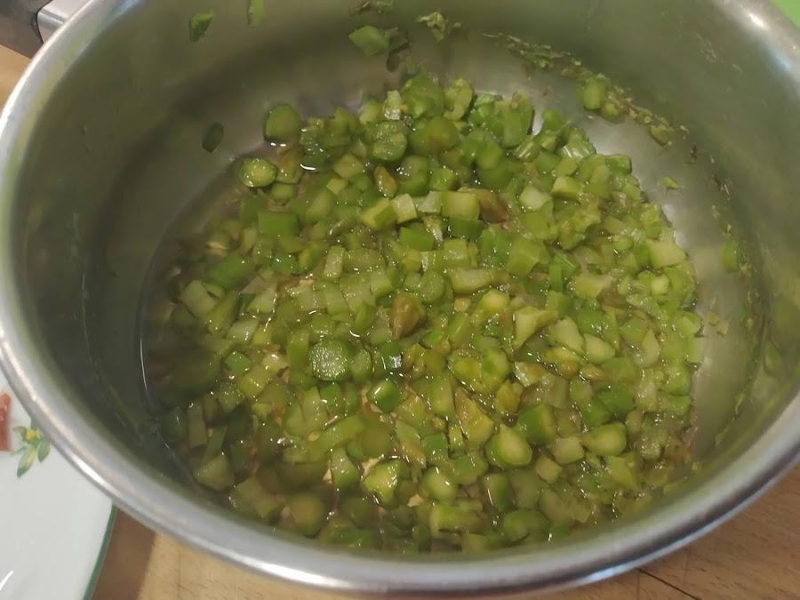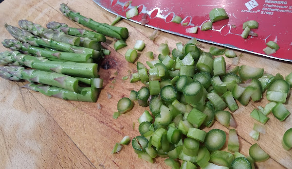 Lavar y picar la parte blanda de los espárragos en trocitos pequeños, echarlos en una cacerola con agua y un poco de sal, cocerlos hasta comprobar que están blandos. Apartar del fuego y reservar.
