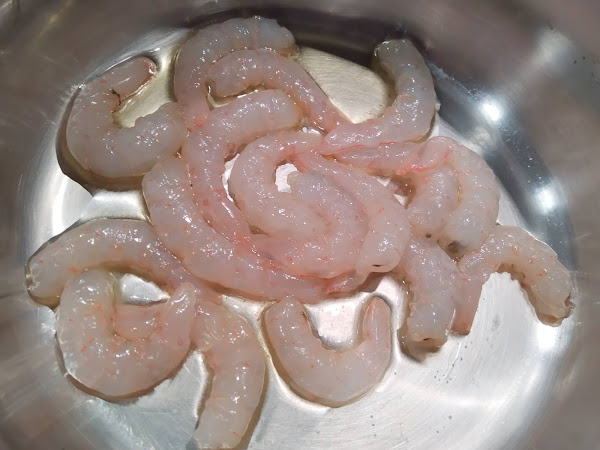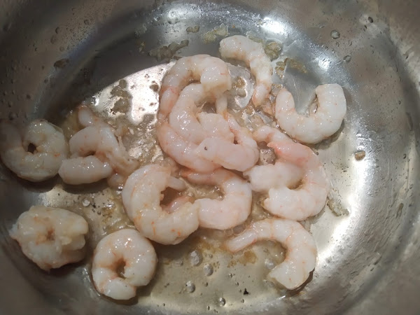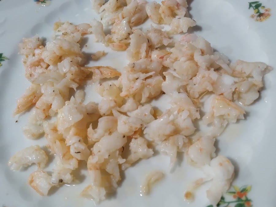 Pelar las gambas, echar aceite de oliva virgen extra en una sartén y dorar la carne durante uno o dos minutos, removiendo. Cortar las gambas en trocitos pequeños y reservar igualmente
