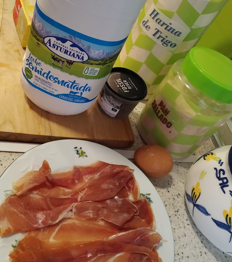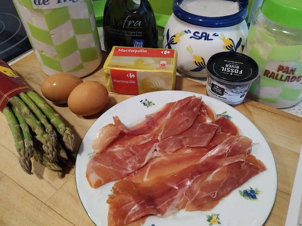 Una docena de espárragos verdes gordos, dos huevos, 100 grms. de jamón serrano, cuatro cucharadas soperas grandes de mantequilla, una taza bien colmada de harina de trigo, dos tazas de leche, sal negra del Himalaya (sabe a huevo frito y se puede encontrar en grandes superficies), 100 grms. de gambas frescas, sal, pan rallado y dos cucharadas soperas de aceite de oliva virgen extra. Para freir las croquetas aconsejo abundante aceite de oliva virgen extra.