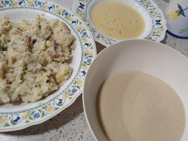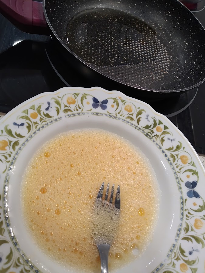 Preparar un recipiente con el otro huevo batido y salado con la sal del Himalaya, un cuenco con abundante pan rallado.