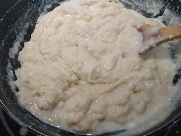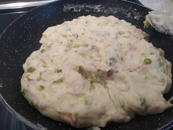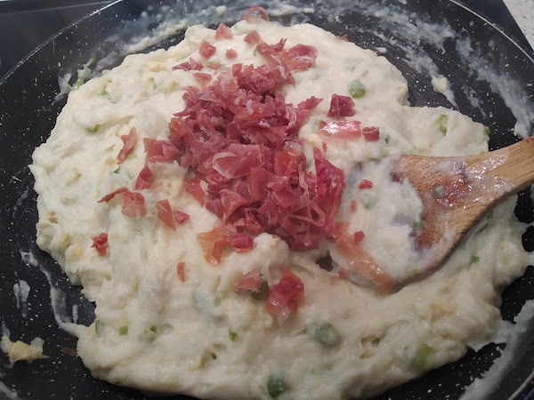Añadir la leche removiendo suavemente hasta conseguir que la harina se diluya realizando una bechamel sin grumos. Echar los trozos de espárragos bien escurridos, los trozos de gambas, la tortilla y por último el jamón serrano sin dejar de remover a fin de que se vayan integrando todos los ingredientes. Seguir removiendo hasta que la masa se despegue sin problemas de las paredes de la sartén. Pasar a un recipiente, tapar con papel film y dejar enfriar a temperatura ambiente.
