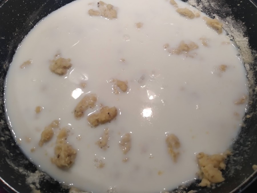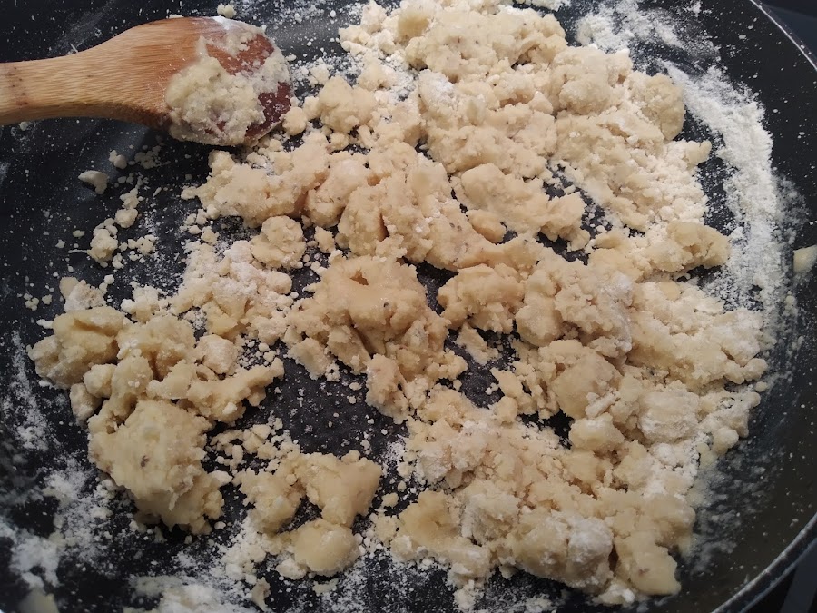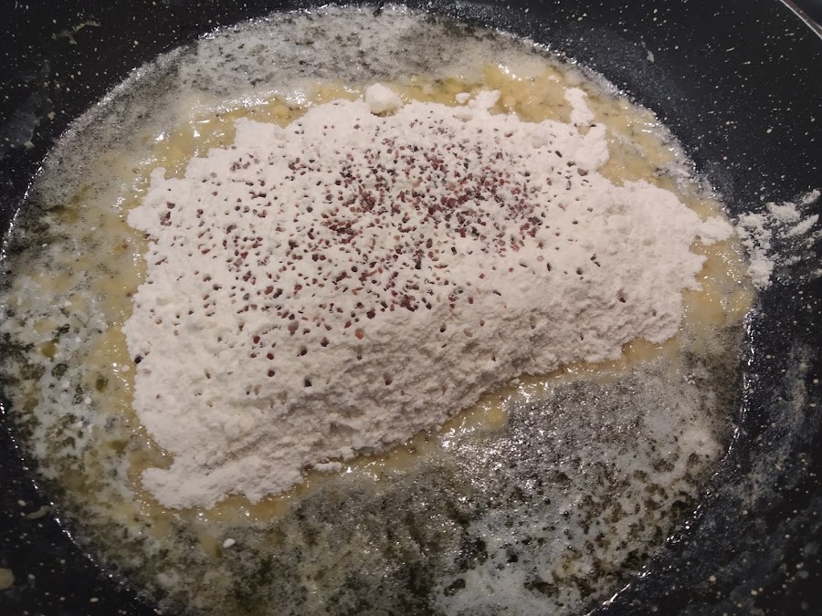 En una sartén grande echar la mantequilla, ponerla al fuego y una vez derretida incorporar la harina, salar con sal del Himalaya y removiendo con una cuchara de madera, tostarla durante un minuto a fin de que posteriormente las croquetas no sepan a harina cruda.