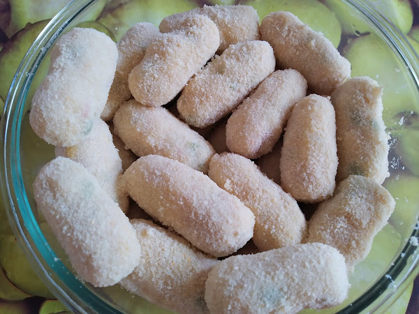 Ir pasando las croquetas por huevo batido, posteriormente por pan rallado e ir dejándolas en un recipiente cubriéndolas con papel film, dejándola reposar unas horas en el frigorífico a fin de que tomen cuerpo.