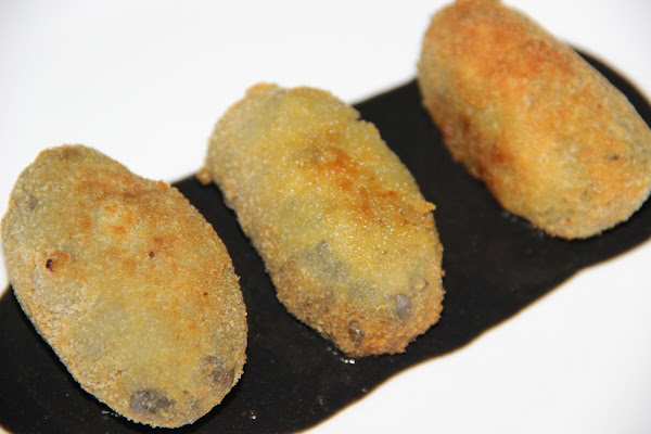 para presentar echaremos un poco de la salsa de los txipirones en el fondo del plato y encima 3 o 4 croquetas y a comer.