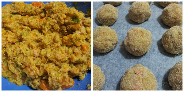Formamos bolitas que iremos pasando por pan rallado y las posicionamos en una bandeja con papel vegetal.