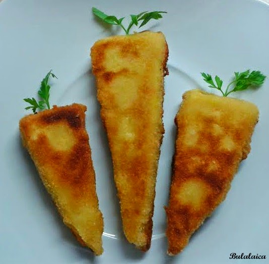 Una vez ha pasado el tiempo en la nevera, cortaremos la masa en triangulitos simulando la forma de la zanahoria. Pasaremos por harina, huevo y finalmente pan rallado.