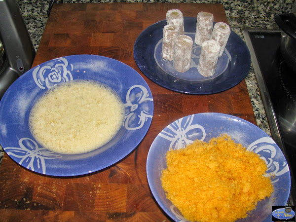 Ahora solo nos queda enharinar las salchichas y pasarlas por huevo y los gusanitos machacados.Y por fin freírlas.