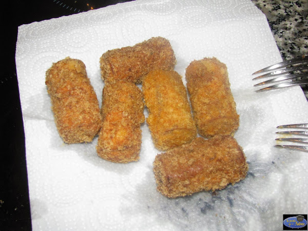 Debo decir que mi idea del plato eran salchichas rellenas con mostaza y luego hacer la tontería de pasarlas por los gusanitos. Pero cual fue mi sorpresa cuando las saco de la freidora y son clavaitas a unas croquetas.