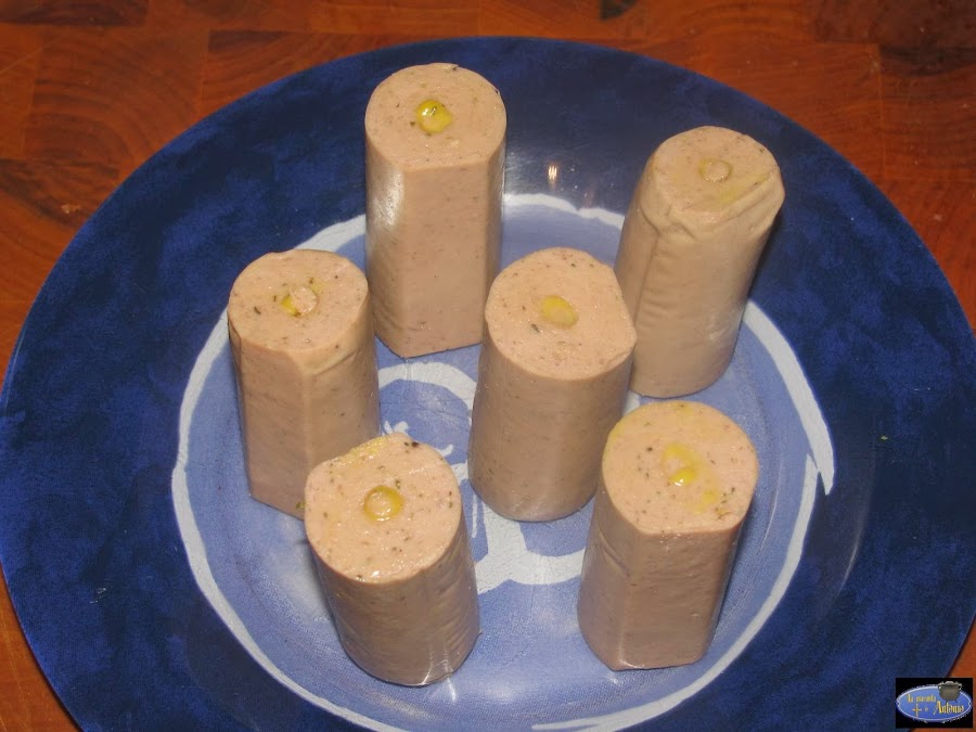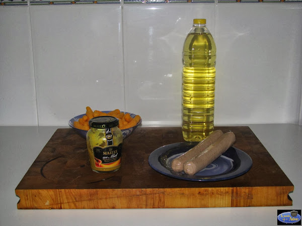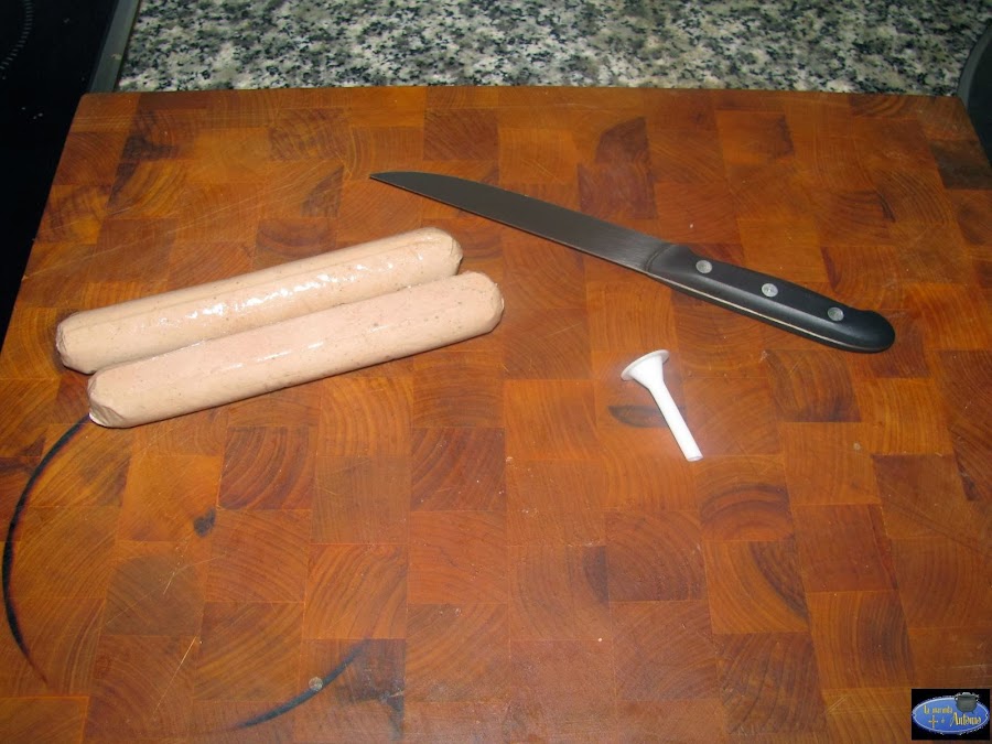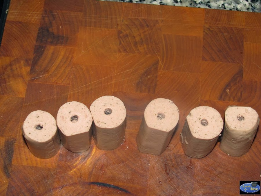 Al principio experimente con salchichas más pequeñas, haciéndoles un corte y rellenando con mostaza pero se destruían al freírlas o perdían toda la mostaza.Así que cambie de técnica.Como las salchichas eran grandes las corté en tres partes iguales.Con una boquilla tipo lanza de una manga pastelera hice los agujeros sin llegar al otro extremo y guardé el relleno que había sacado.