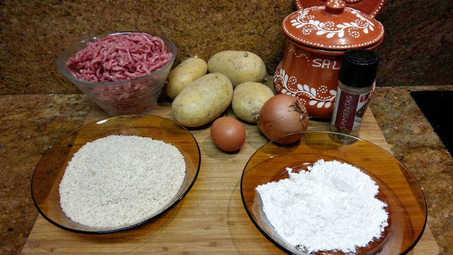 4 patatas medianas, 1 cebolla, 500 gr de carne picada de ternera, 2 huevos, harina, panko (pan rallado japonés), aceite de oliva, pimienta molida y sal
