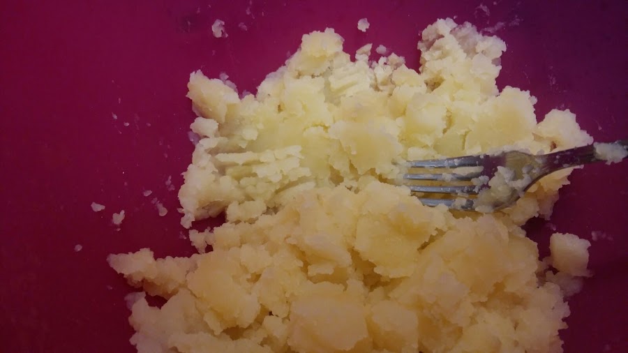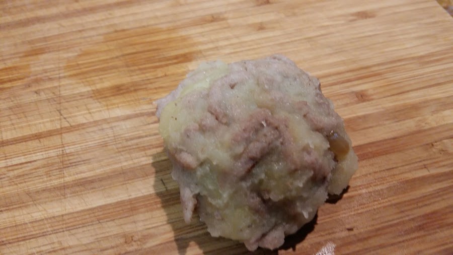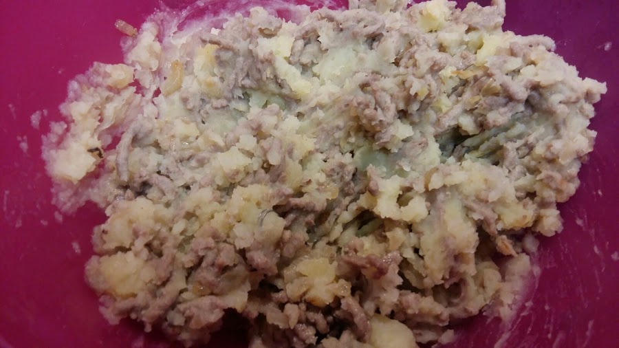 Añadiremos a la patata chafada la mezcla de carne y cebolla cocinada y dejaremos que enfríe un poco.