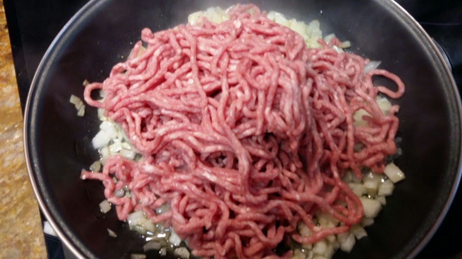 Una vez que la cebolla se pone un poco transparente, añadiremos la carne picada, salpimentamos y sofreímos.