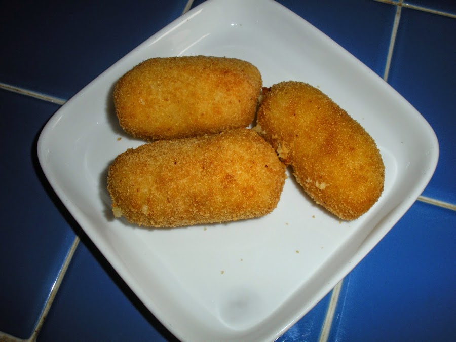 Cuando se hay enfriado, batimos los huevos y empezamos a formar croquetas, las pasamos por pan rallado-huevo-pan rallado y las vamos colocando en un plato para que se endurezcan.