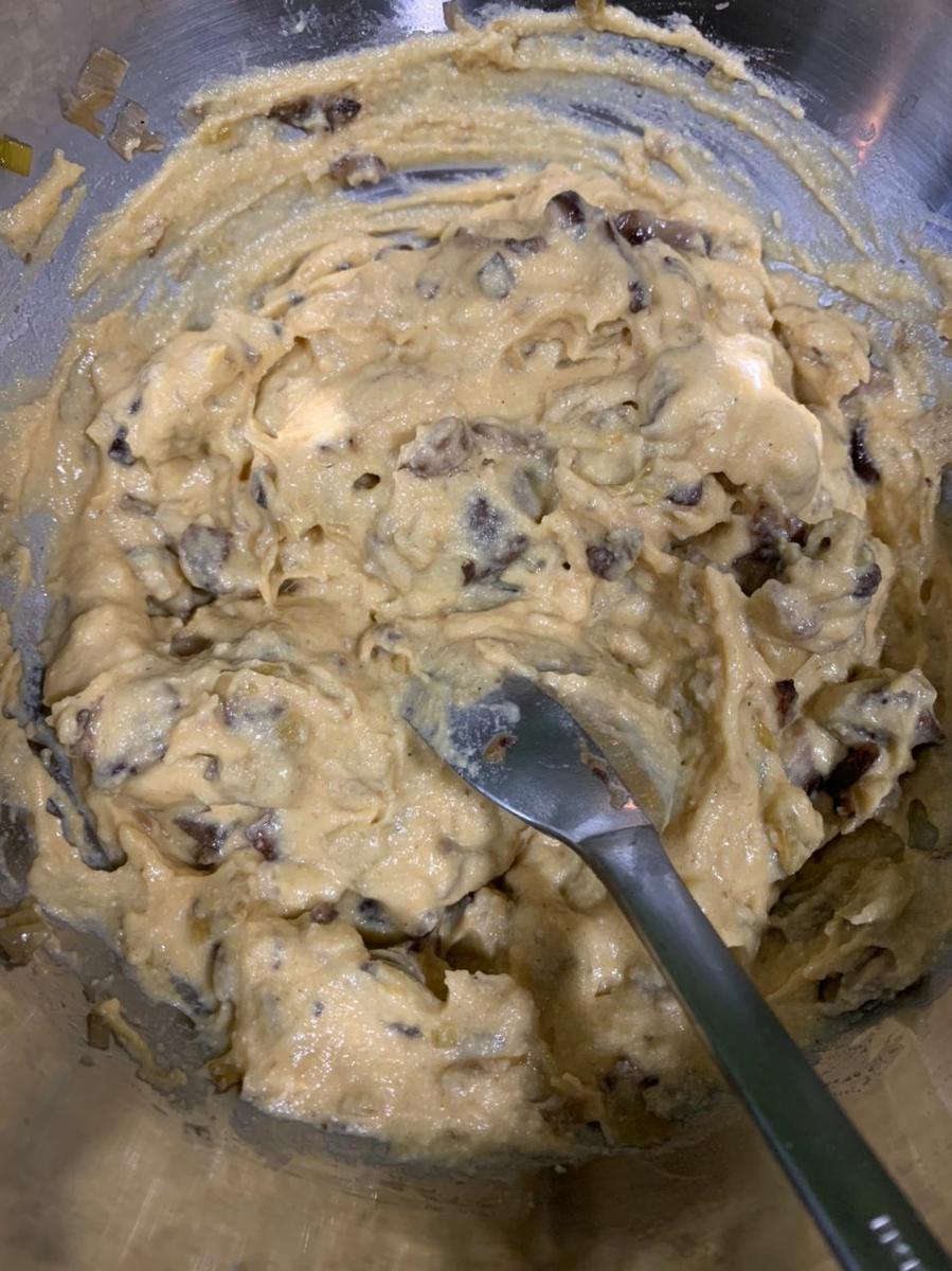 En un vaso ponemos la patata pelada, el boniato pelado, los dos huevos y las 4 cucharadas de harina de avena y trituramos todo. Cuando lo tengamos añadimos 150gr de la mezcla de setas y unimos todo bien. Tapamos y dejamos en la nevera unas dos horas para que se ponga la masa un poco mas dura.