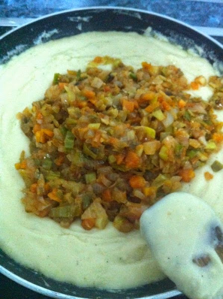 Y cuando ya lo tengamos al punto, añadiremos el sofrito y removeremos bien.