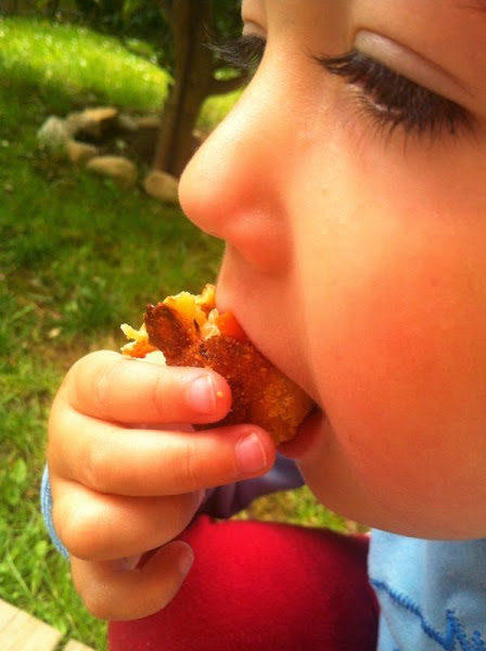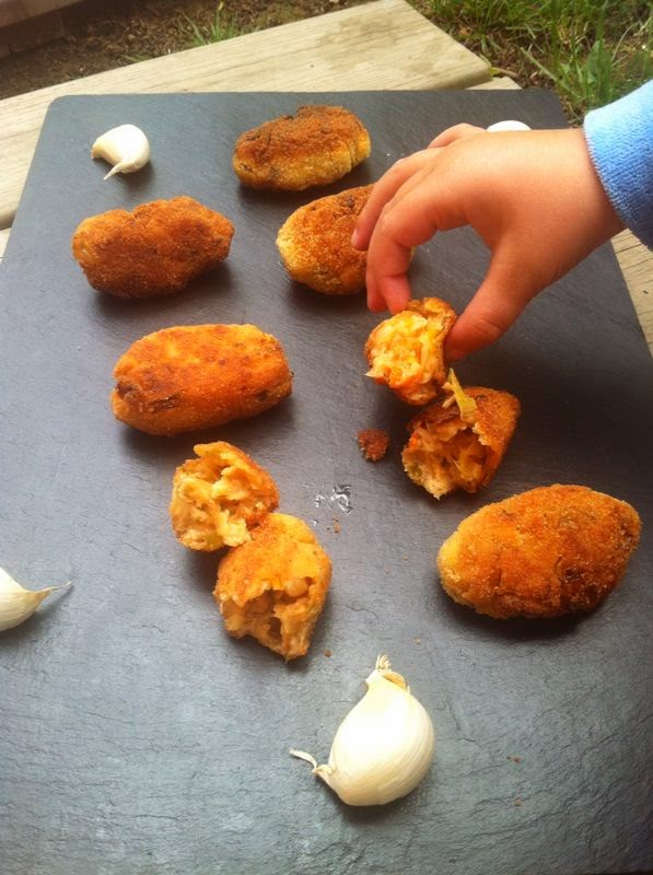 Se ha comido 3 croquetas sin verlas. Para que veáis que manera mas buena de darles verduras enteras a los mas peques de la casa.