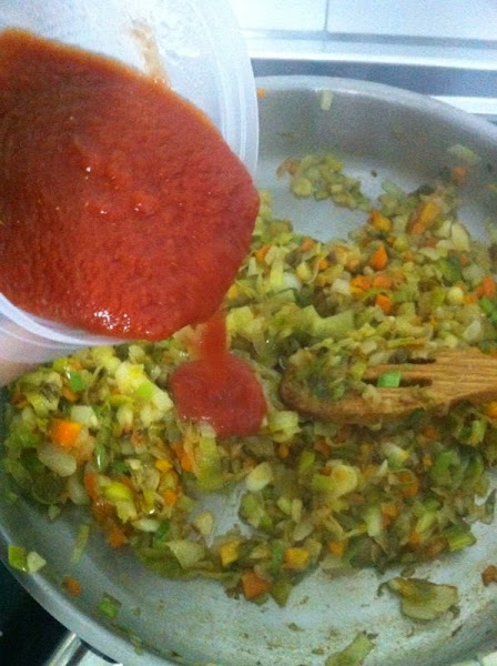 Un poco de sal por todo, removemos, y añadimos un chorro de tomate triturado. No demasiado, puesto que no queremos que nos quede liquido el sofrito.