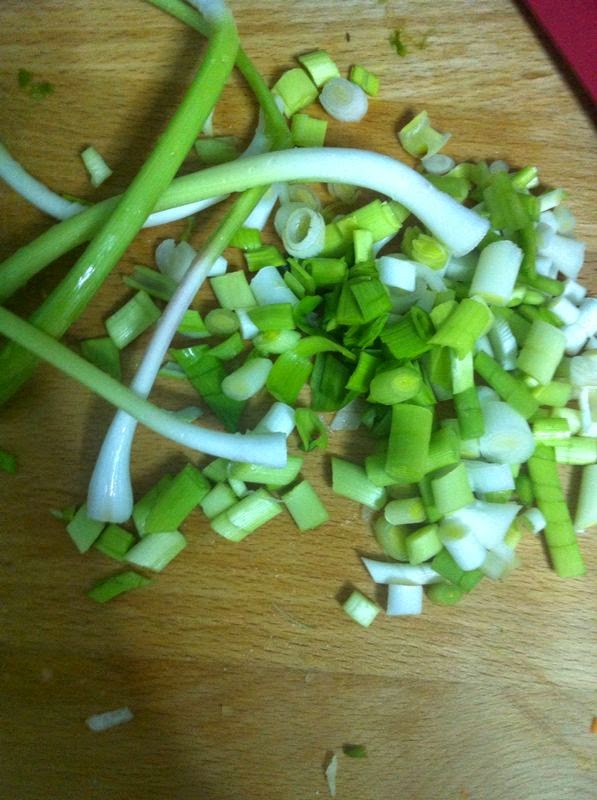 Ahora los ajetes tiernos. Los lavaremos, picaremos y a la sartén...