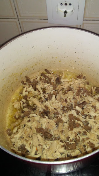 Ø Cuando la cebolla tome un poco de color, añadir la carne desmigada y dorarla unos minutos en la mantequilla con la cebolla. Mezclar y darle vueltas para que toda la preparación sefria un poco.