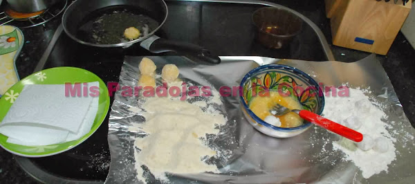Aquí es dónde he querido contribuir, entre otras cosas, presentándolas empanadas en lugar de servirlo del modo tradicional, es decir, con el pan frito, además de añadirles piñones y acompañandolas de salsas dulces. (También he hecho una presentación adicional si no se quiere hacer en croquetas).