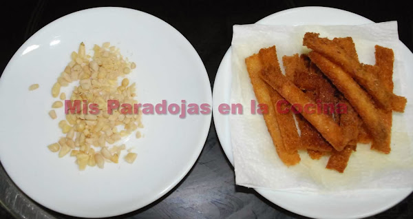 TERCERO: Mientras se aromatizan la leche y el aceite, picaremos a cuchillo los piñones (ya sean crudos o tostados ligeramente, según nuestro gusto). Si lo que queremos es presentarlo del modo clásico, freíremos el pan que reservaremos en papel absorbente. Yo lo he cortado en barritas, pues me parece más bonito que el currusco.
