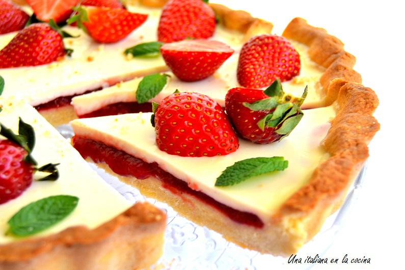 ¡Ya ha llegado el séptimo cumpleaños del blog y hay que celebrarlo con una tarta! Hoy he preparado esta crostata de fresas y panna cotta. Es un postre que llama mucho la atención por sus colores y que conquista al primer bocado gracias a sus contrastes de texturas.La crostata es un postre italiano muy común en mi país, hay muchas formas de prepararla y es muy versátil porque se puede rellenar al gusto. Las recetas de crostata más tradicionales suelen llevar mermelada de albaricoque o nutella y son las que se suelen preparar en las mayoría de los hogares italianos. Esta tarta que he preparado es muy especial y no es la clásica crostata. La base de pasta frola lleva también almendra molida, lo que la hace aún más sabrosa y crujiente. La mermelada de fresa le aporta ese toque cremoso y la panna cotta es la coronación de la receta. El resultado final es increíble, tienes que probarla.