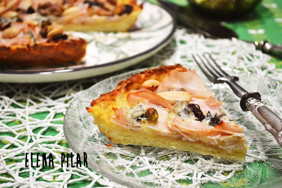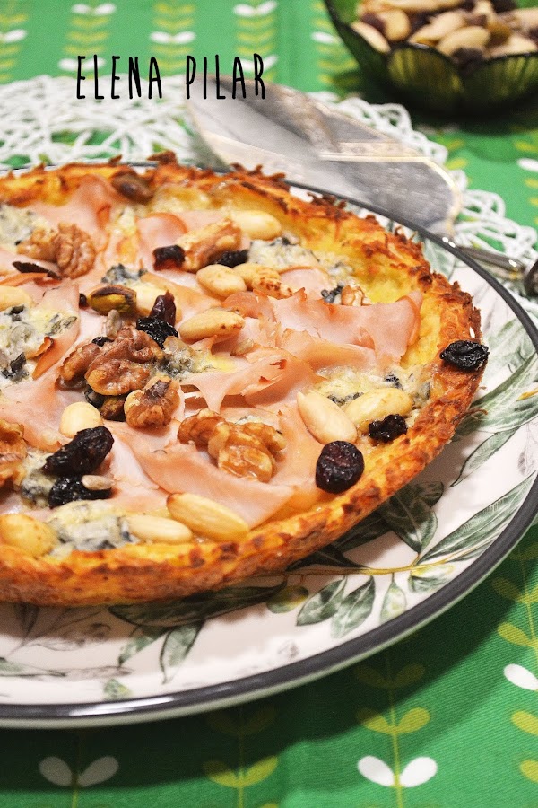 Una vez horneada la base, la sacamos del horno e iremos rellenando con el resto de ingredientes. En primer lugar, el queso havarti rallado. Sobre éste, la pechuga de pavo en lonchas, los frutos secos y, por último, el queso azul desmenuzado.