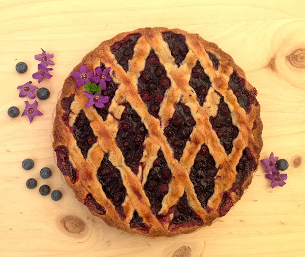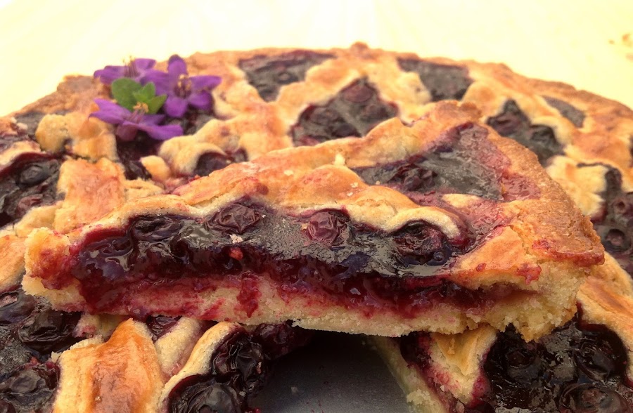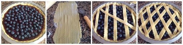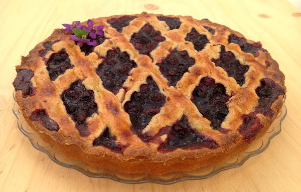 Estiramos con un rodillo la masa restante, dejándola de 0,5 cm de espesor y cortamos tiras con las que formaremos un enrejado para cubrir la tarta. Pintamos las tiras con huevo batido y cocinamos en horno a 180º, con calor de arriba y de abajo, durante 30 minutos o hasta que se dore.