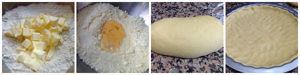 Ponemos en un bol la harina y el azúcar, añadimos la mantequilla troceada y mezclamos con los dedos, desmenuzando la mantequilla hasta obtener una mezcla arenosa. Hacemos un hueco en el centro y colocamos allí el huevo batido con la vainilla. Unimos bien los ingredientes y volcamos la mezcla en la encimera, amasando hasta obtener una masa que no se pegue a los dedos. Engrasamos con mantequilla un molde desmontable y ponemos allí 3/4 partes de la masa, extendiendo bien con los dedos hasta cubrir los bordes. Cubrimos con plástico y dejamos descansar en la nevera durante 1 hora, junto con el 1/4 restante de masa que también envolveremos con plástico para que no se reseque.