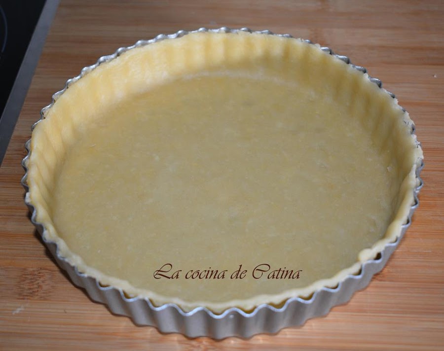 Con la masa sobrante, la extendemos con el rodillo y hacemos tiras que colocaremos sobre la tarta en forma de red.