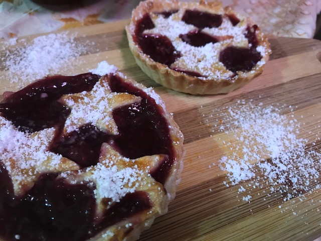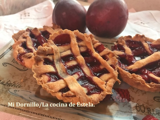 3- Espolvorear la mesa con un poco de harina, estirar con el rodillo, pasándolo suavemente, o estirar sobre papel de hornear, hacer la forma y poner en un molde redondo con papel de hornear o forrar moldes pequeños, poner la mermelada elegida. Y con el reto de la masa hacer una rejilla que tape la tarta. Lo mejor es cortar la masa con cortador que queda mas bonita, yo no tenia y lo hice con el cuchillo. Otras las hice de forma de estrella.